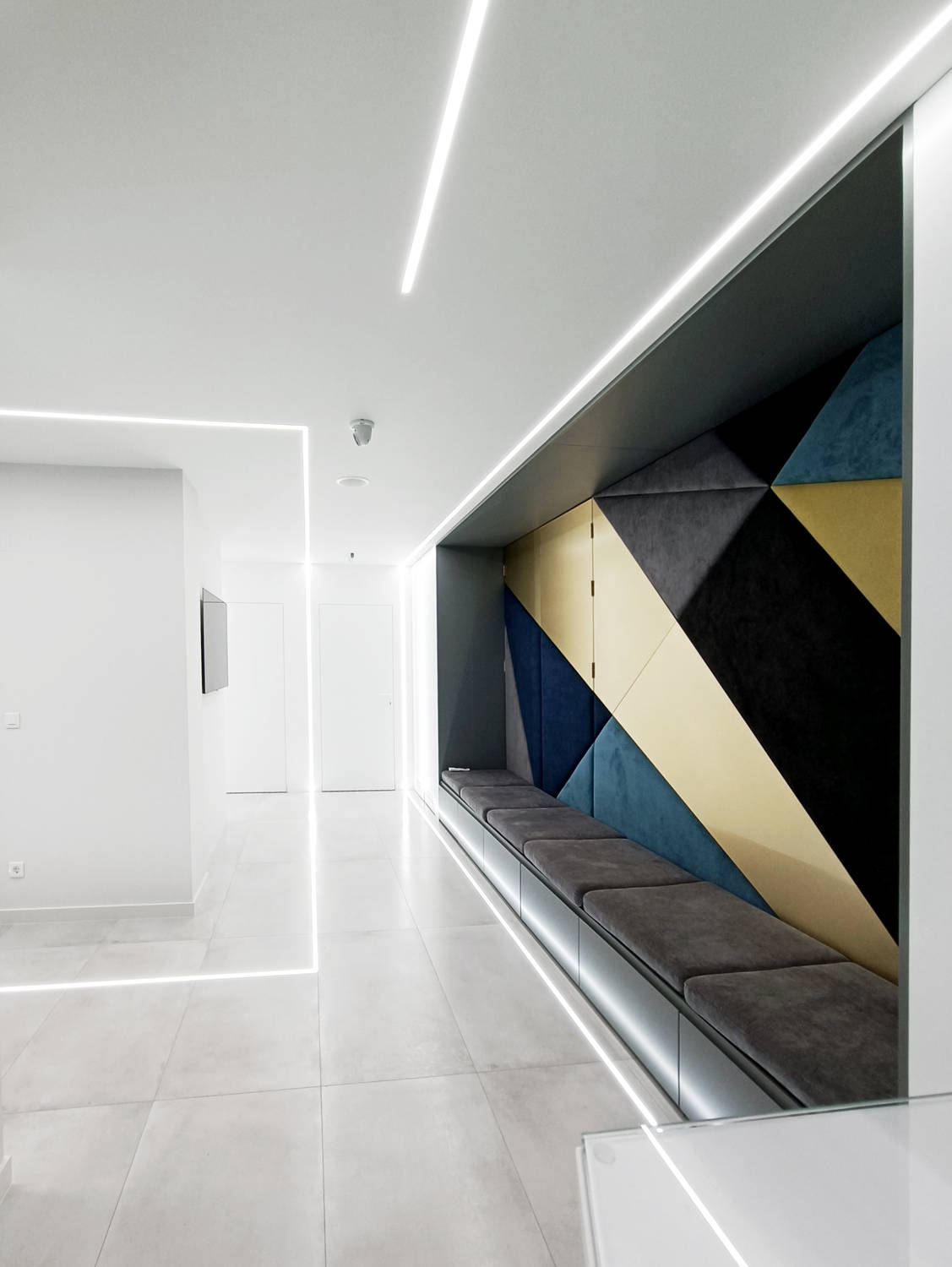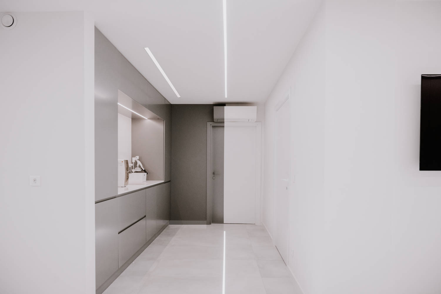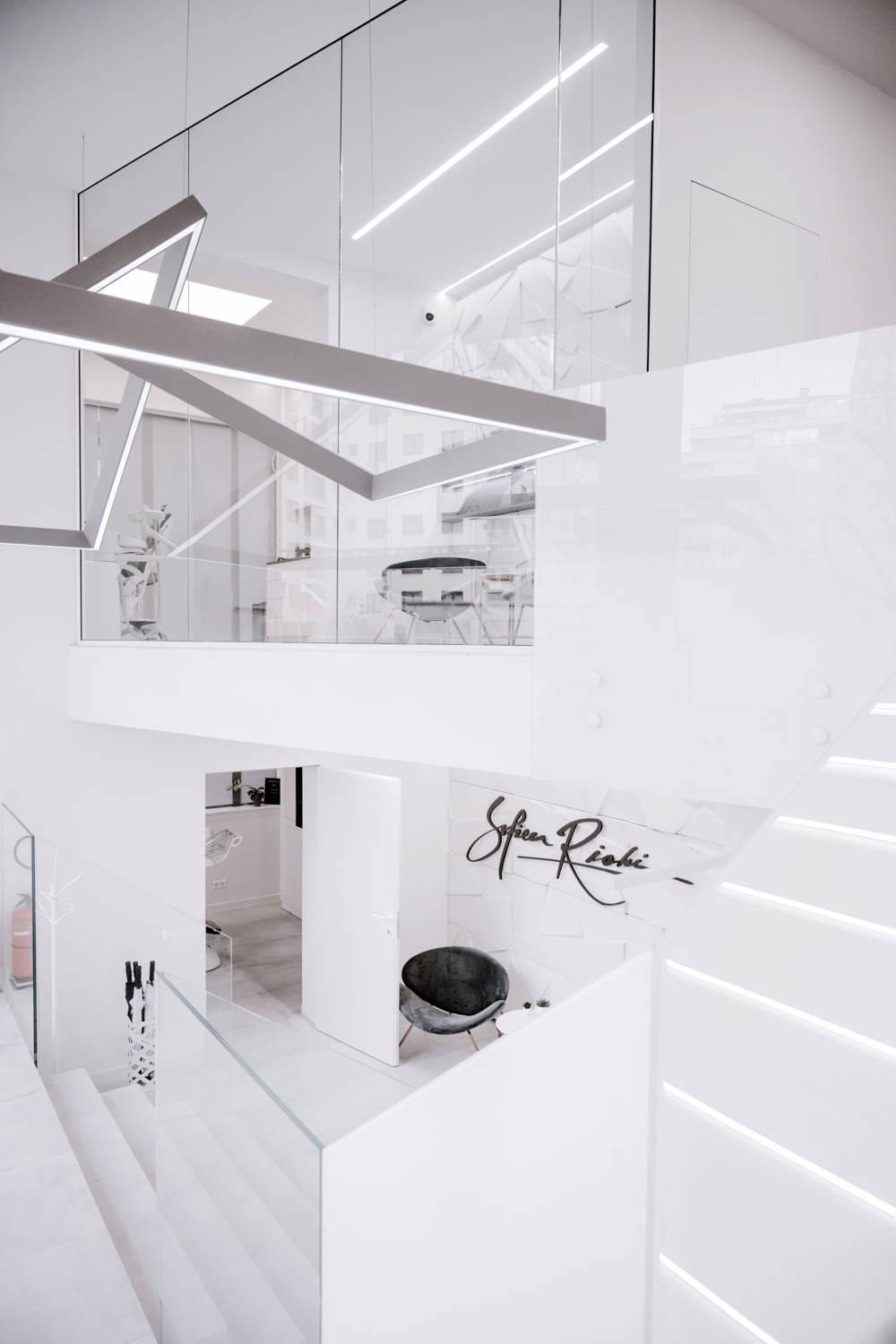 Модерна дентална клиника, в която светлина, текстури и линии се пресичат, за да създадат една футуристична и запомняща се визия.