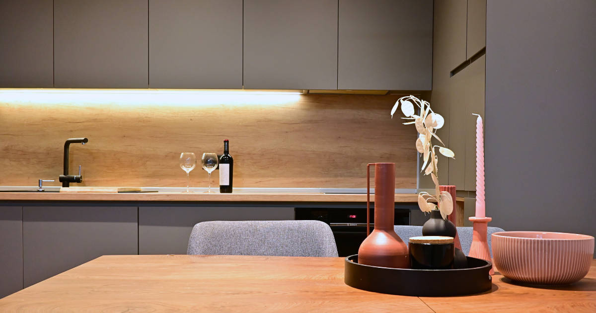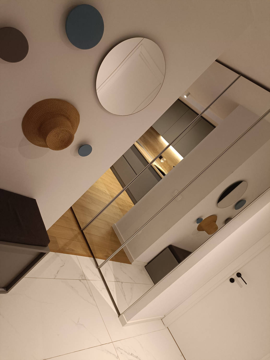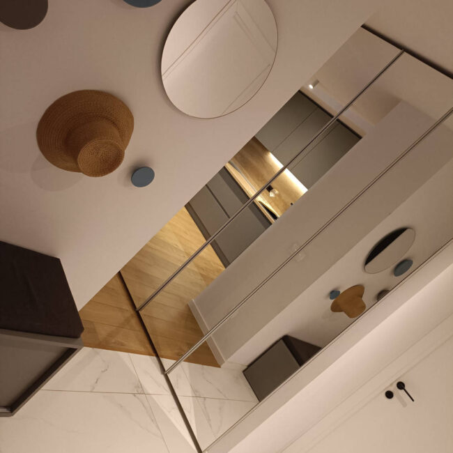 С внимателно премислено разпределение на помещенията и сравнително малки корекции успяхме да постигнем максимално използваема площ, без да правим компромис с необходимите функции. Чистите линии и меки пастелни тонове доминират в интериора, предоставяйки актуален и свеж вид. Светлия дървесен материал добавя топлина и уют, а масивната дървена трапезна маса е фокусен елемент, придаващ характер на цялостната обстановка.