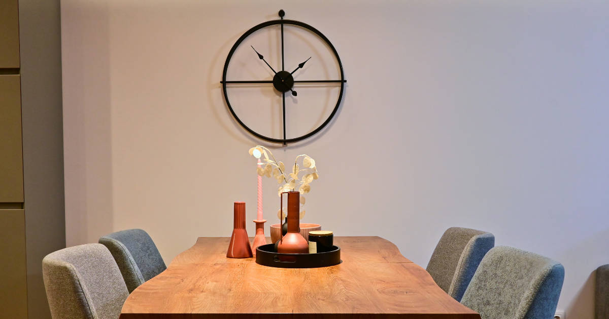 Завършекът на интериора е подчертан от металния черен часовник, който не само отчита времето, но и служи като акцент, подчертаващ безпреходността на дизайна.